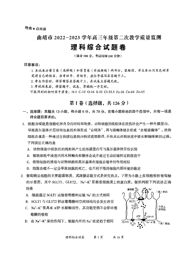 高三理综--云南省曲靖市2023届第二次教学质量检测