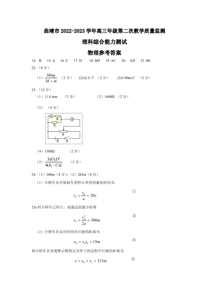 高三物理答案--云南省曲靖市2023届第二次教学质量检测