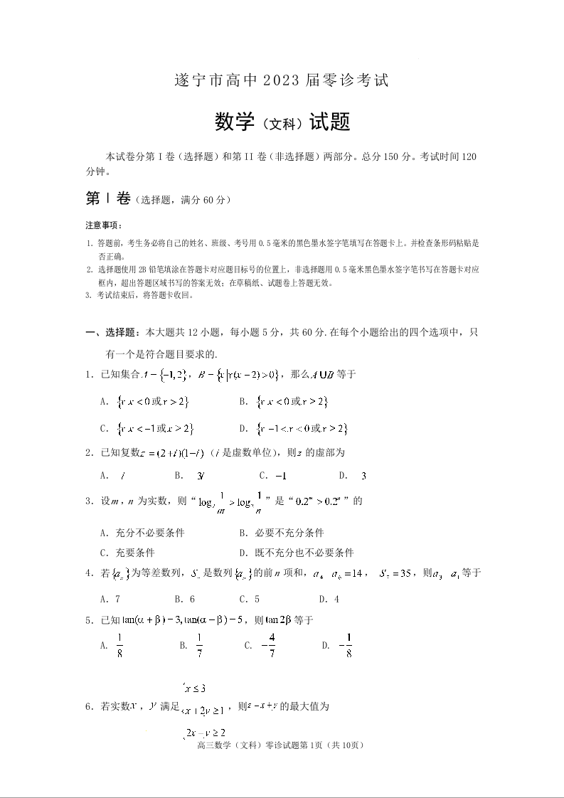 高三文数+答案--四川省省遂宁市2023届高三上学期零诊考试