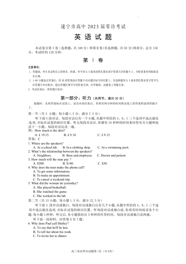 高三英语--四川省省遂宁市2023届高三上学期零诊考试