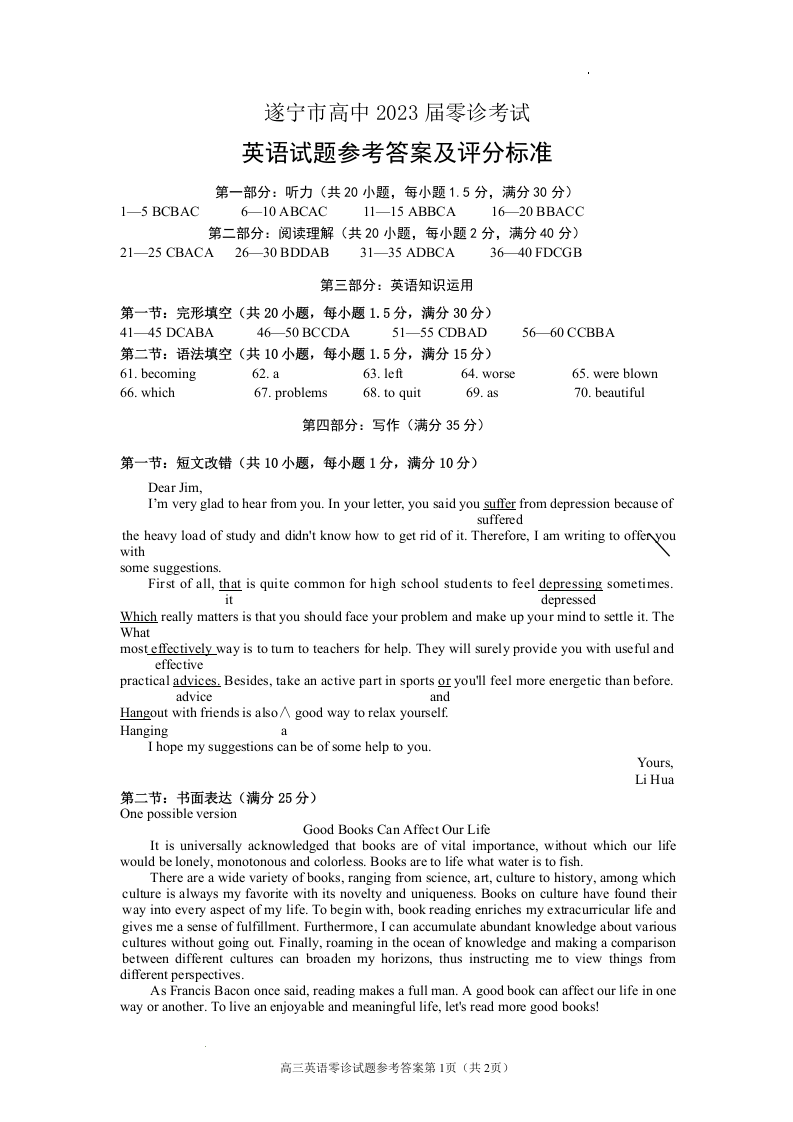 高三英语答案--四川省省遂宁市2023届高三上学期零诊考试