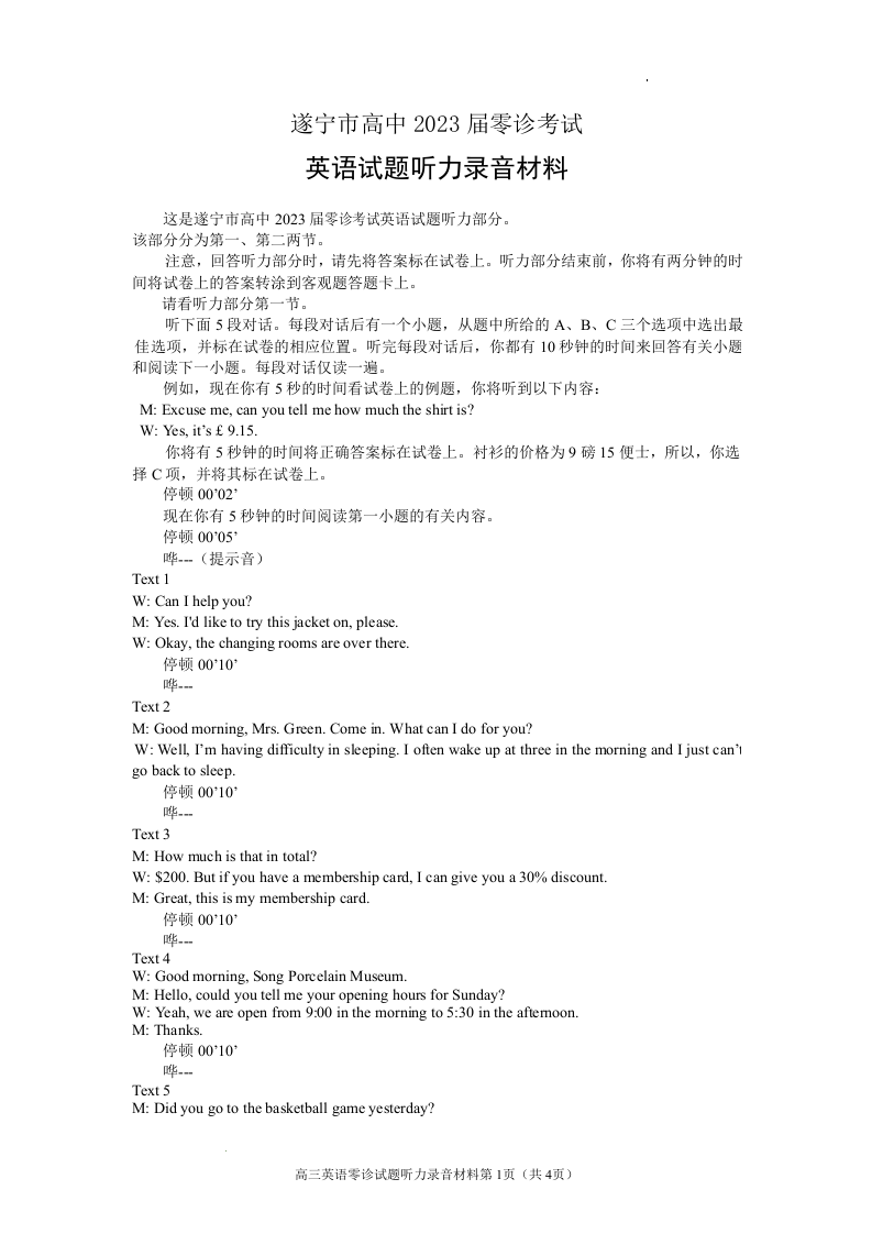 高三英语听力--四川省省遂宁市2023届高三上学期零诊考试