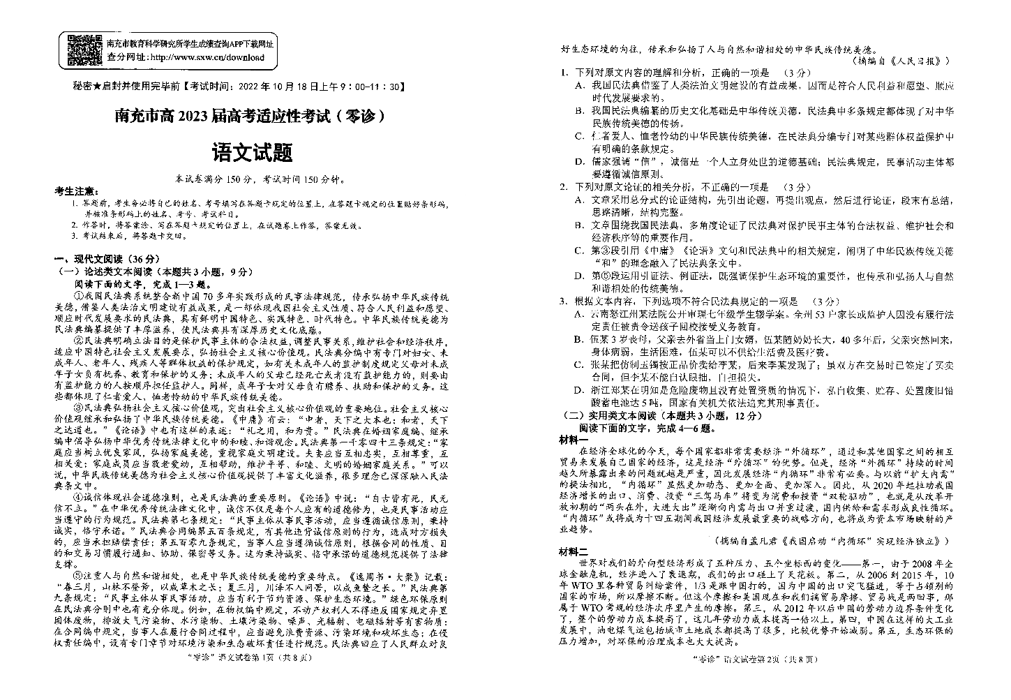 高三语文-四川省南充市2023届高三零诊