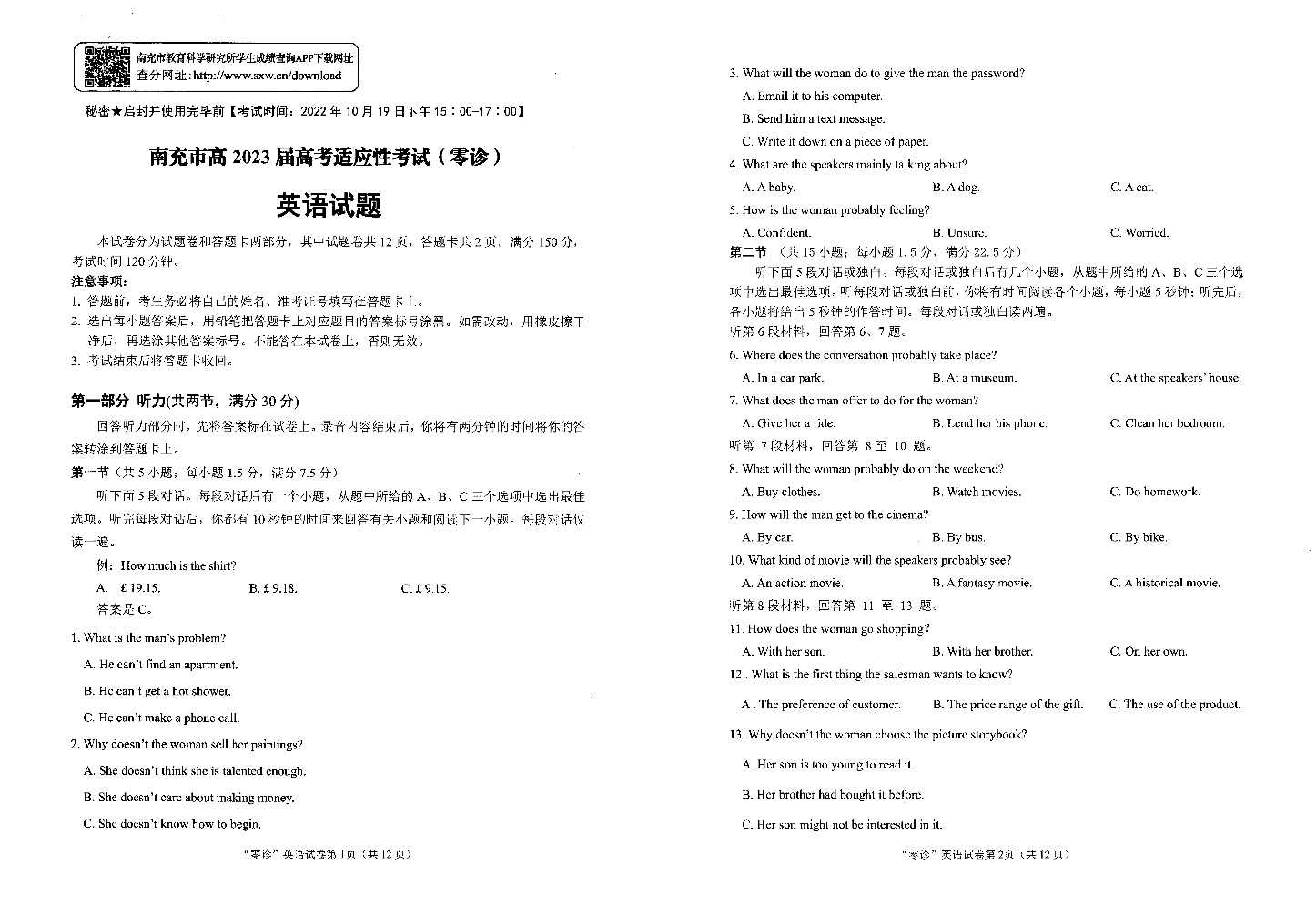 高三英语-四川省南充市2023届高三零诊
