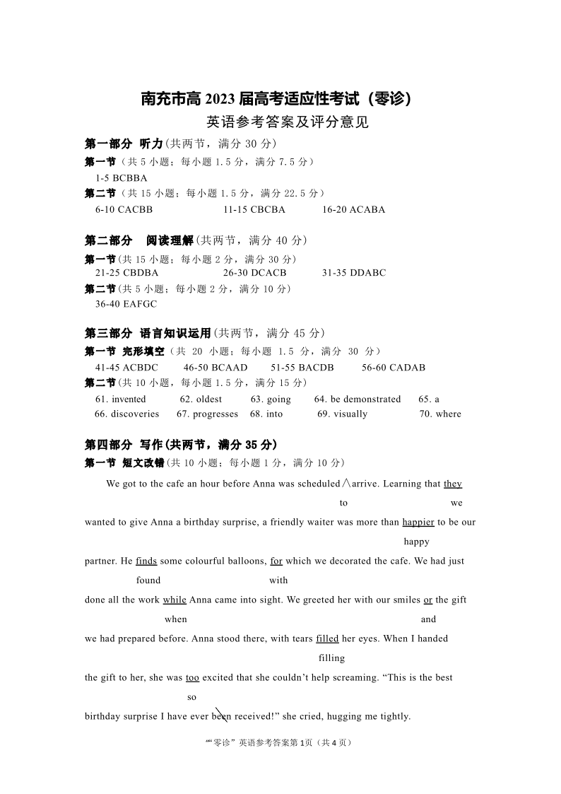 高三英语答案-四川省南充市2023届高三零诊