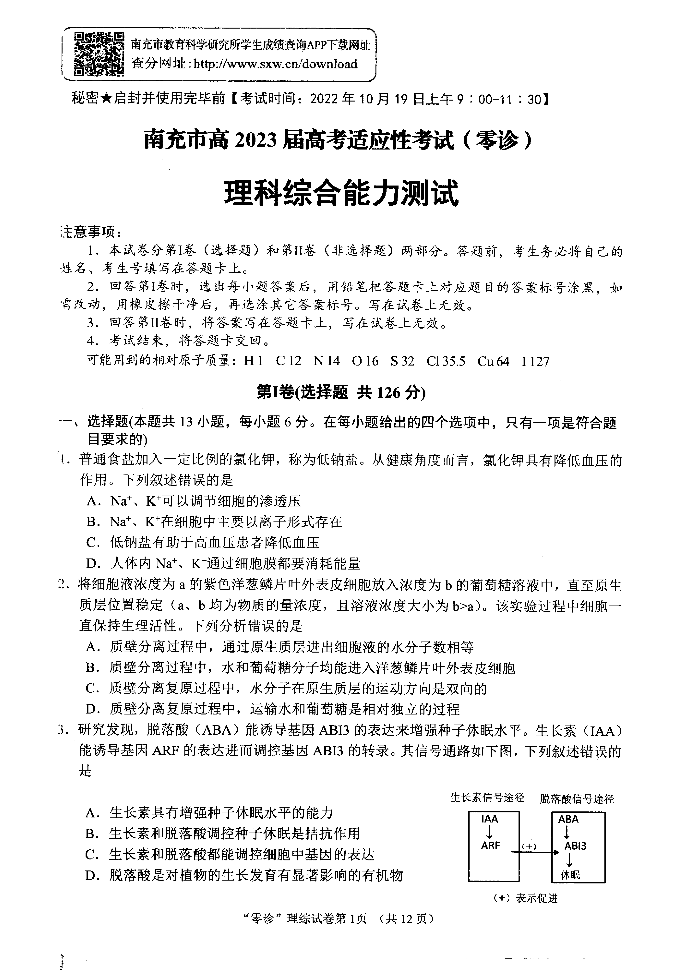 高三理综-四川省南充市2023届高三零诊