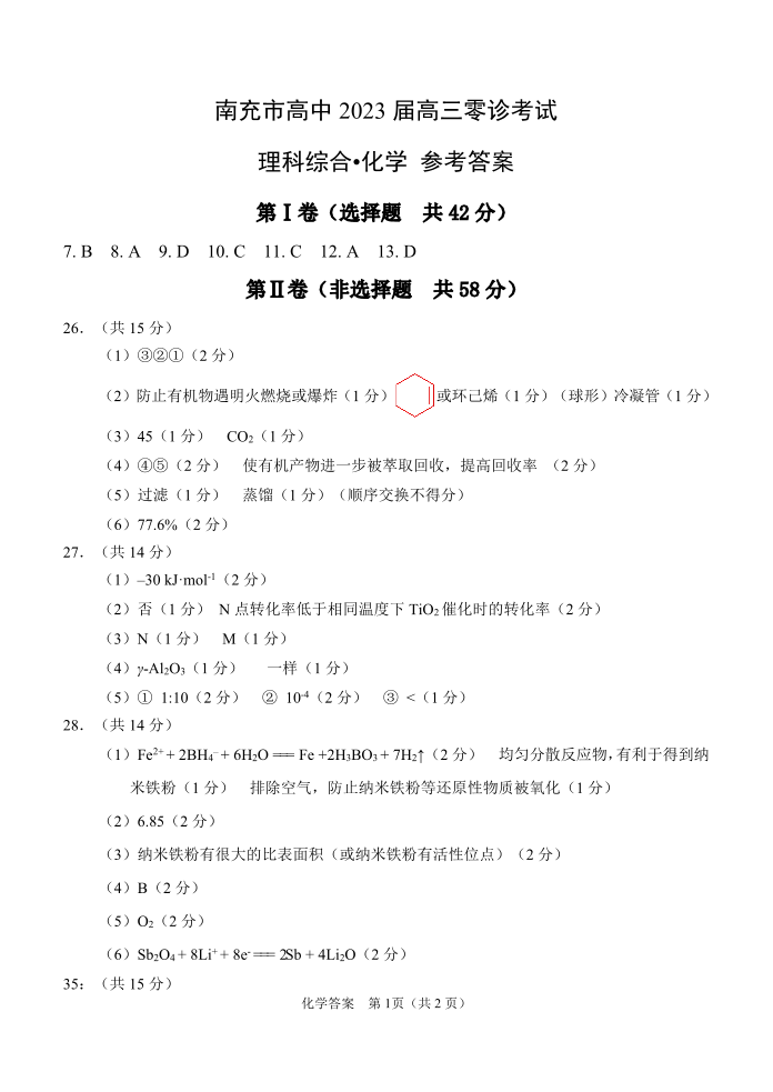 高三理综化学答案-四川省南充市2023届高三零诊