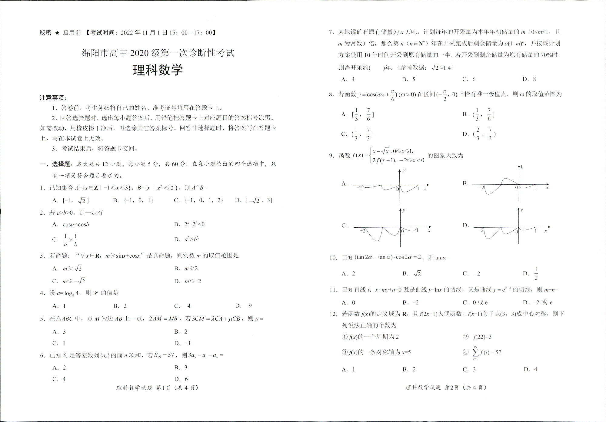 高三理数--四川省绵阳市2023届高三上学期第一次诊断性考试