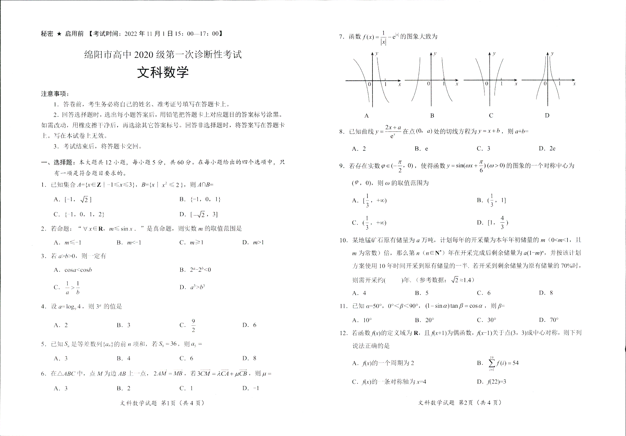 高三文数--四川省绵阳市2023届高三上学期第一次诊断性考试