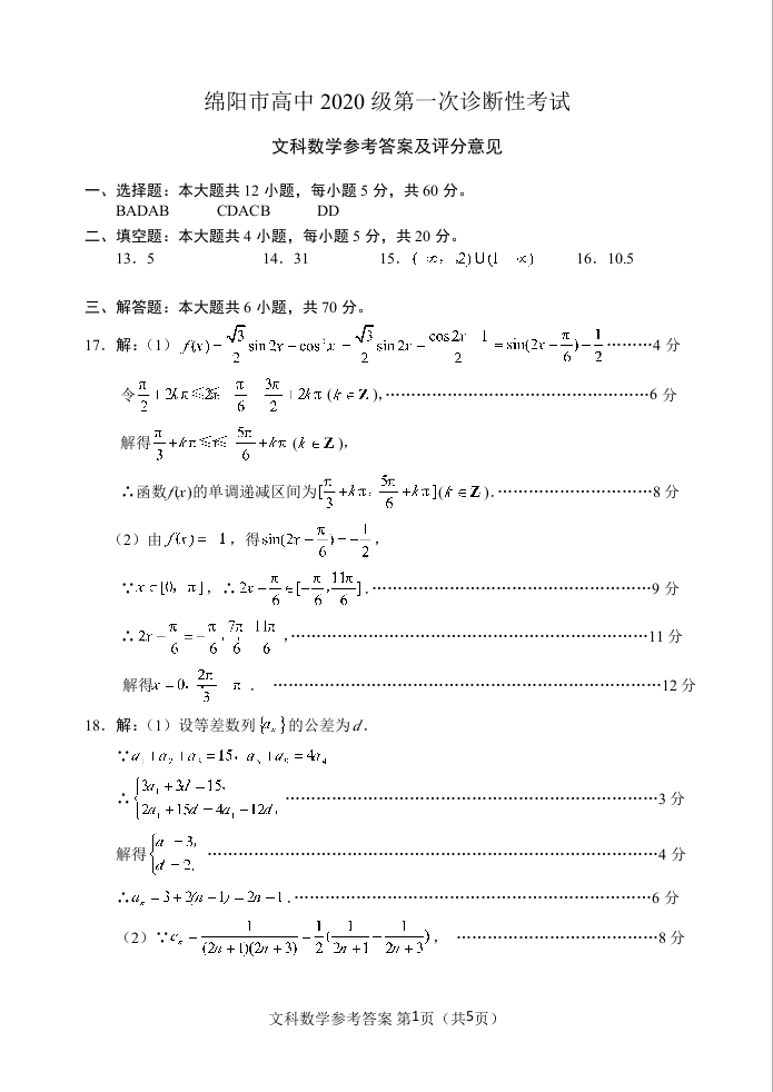 高三文数答案--四川省绵阳市2023届高三上学期第一次诊断性考试
