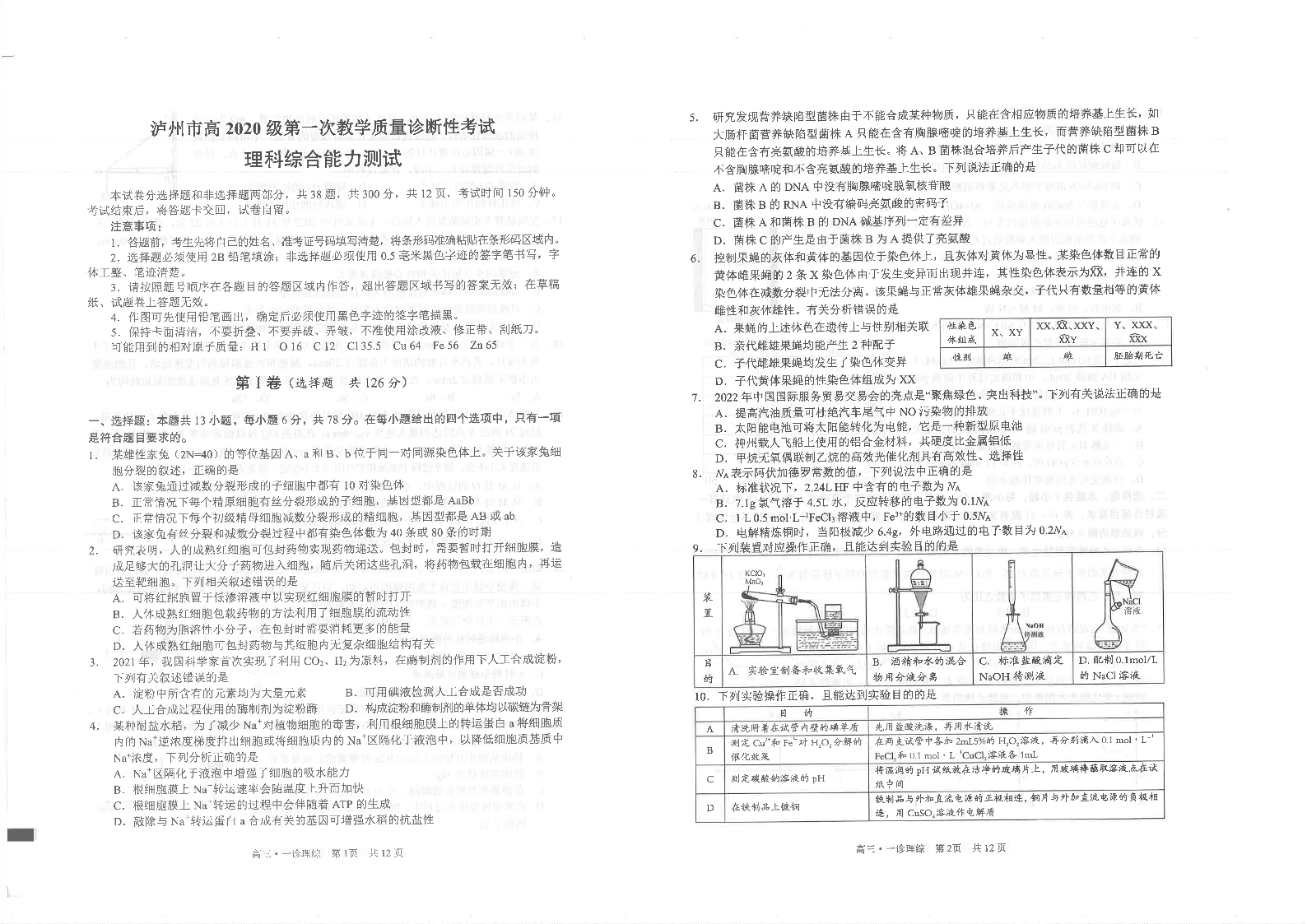 高三理综--四川省泸州市高2023届三上学期第一次教学质量诊断性考试