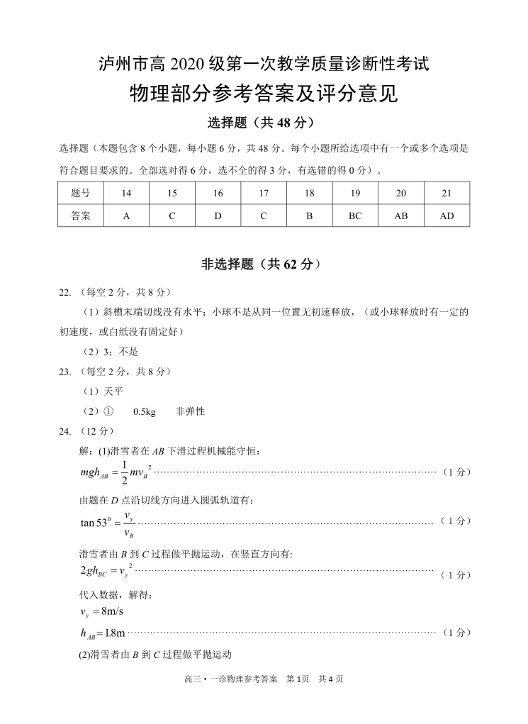 高三理综物理答案--四川省泸州市高2023届三上学期第一次教学质量诊断性考试