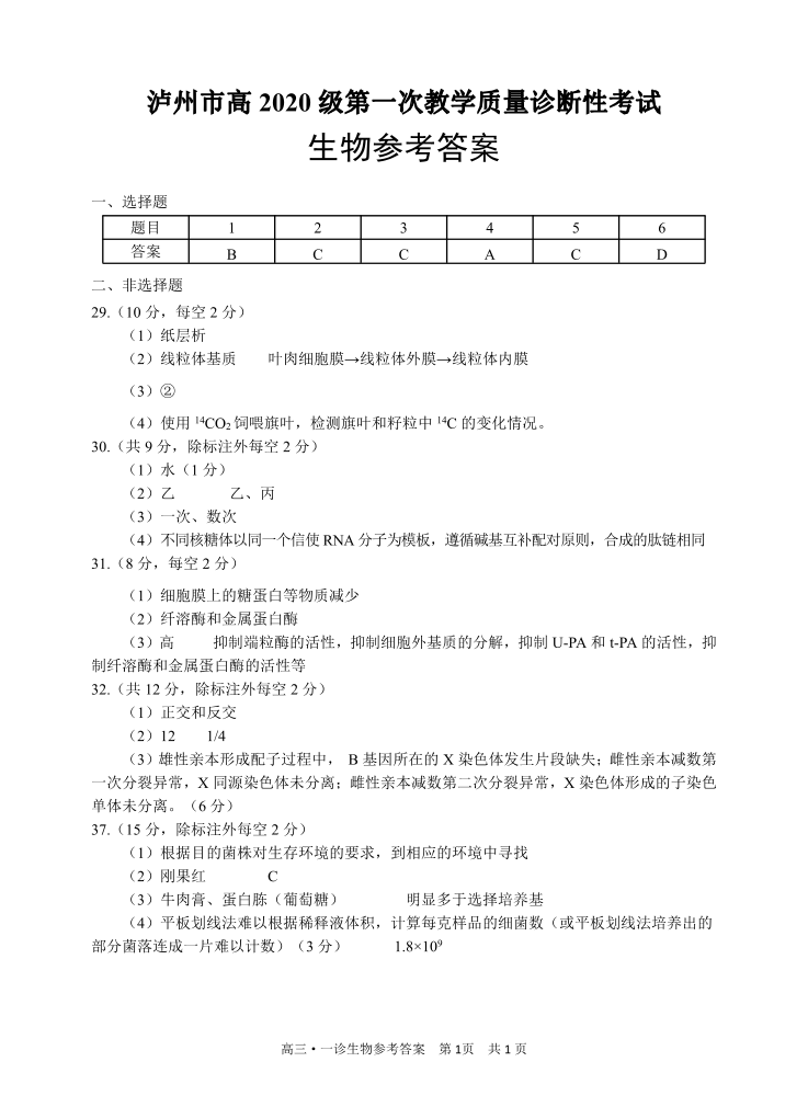 高三理综生物答案--四川省泸州市高2023届三上学期第一次教学质量诊断性考试
