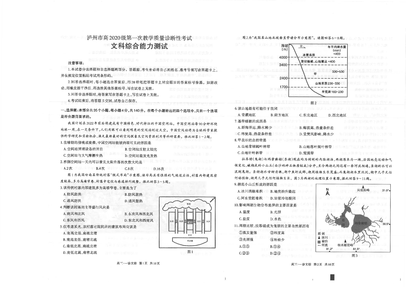 高三文综--四川省泸州市高2023届三上学期第一次教学质量诊断性考试