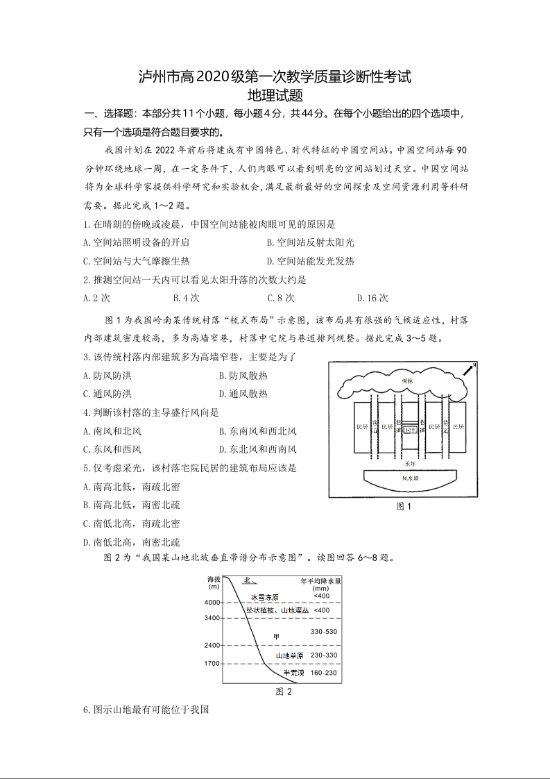 高三文综地理+答案--四川省泸州市高2023届三上学期第一次教学质量诊断性考试