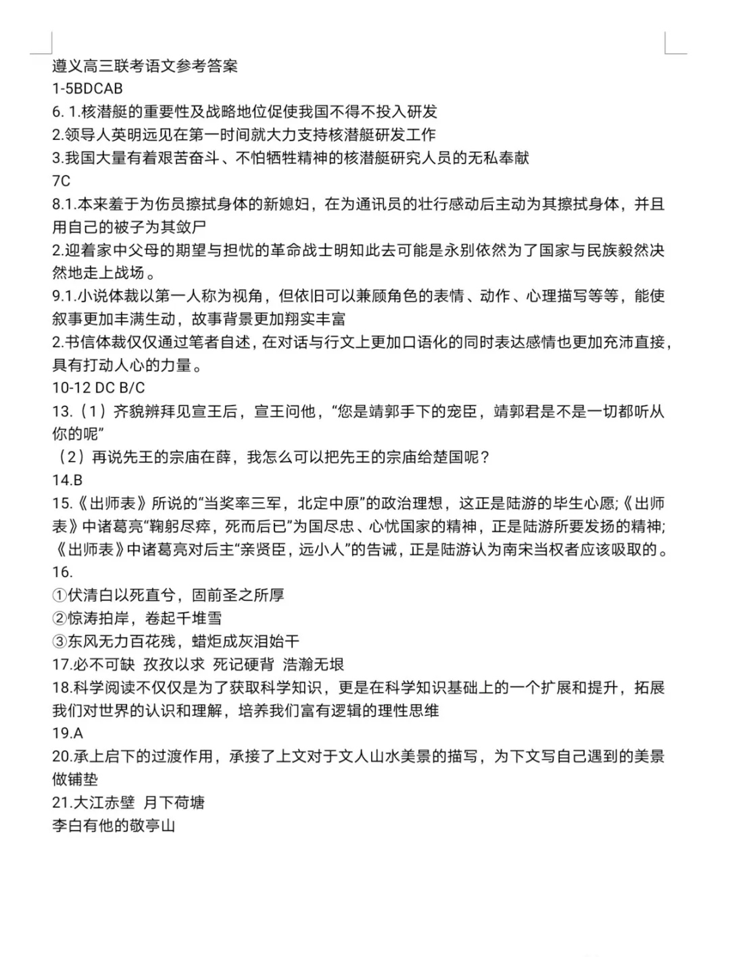 高三语文答案--贵州省遵义市2023届高三上学期第一次统一考试