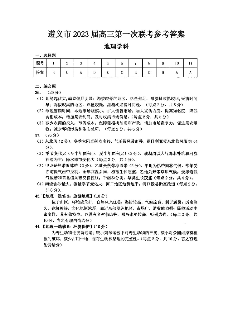 高三文综答案--贵州省遵义市2023届高三上学期第一次统一考试