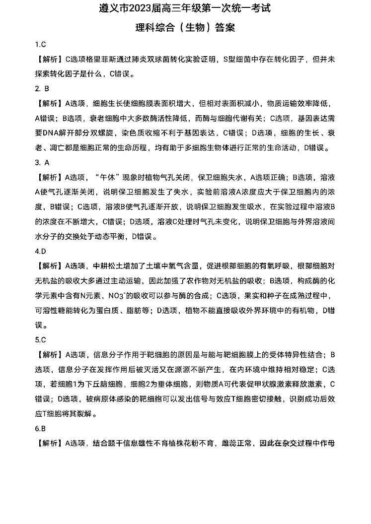 高三理综答案--贵州省遵义市2023届高三上学期第一次统一考试