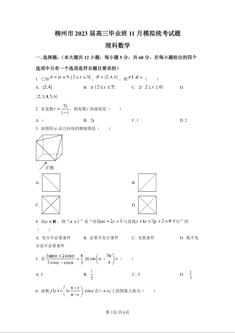 高三理数-广西壮族自治区柳州市2023届高三毕业班11月模拟统考(一模)