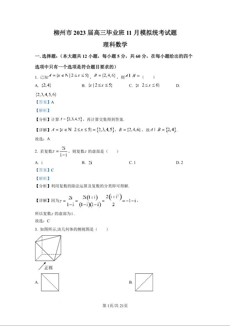 高三理数答案--广西壮族自治区柳州市2023届高三毕业班11月模拟统考(一模)