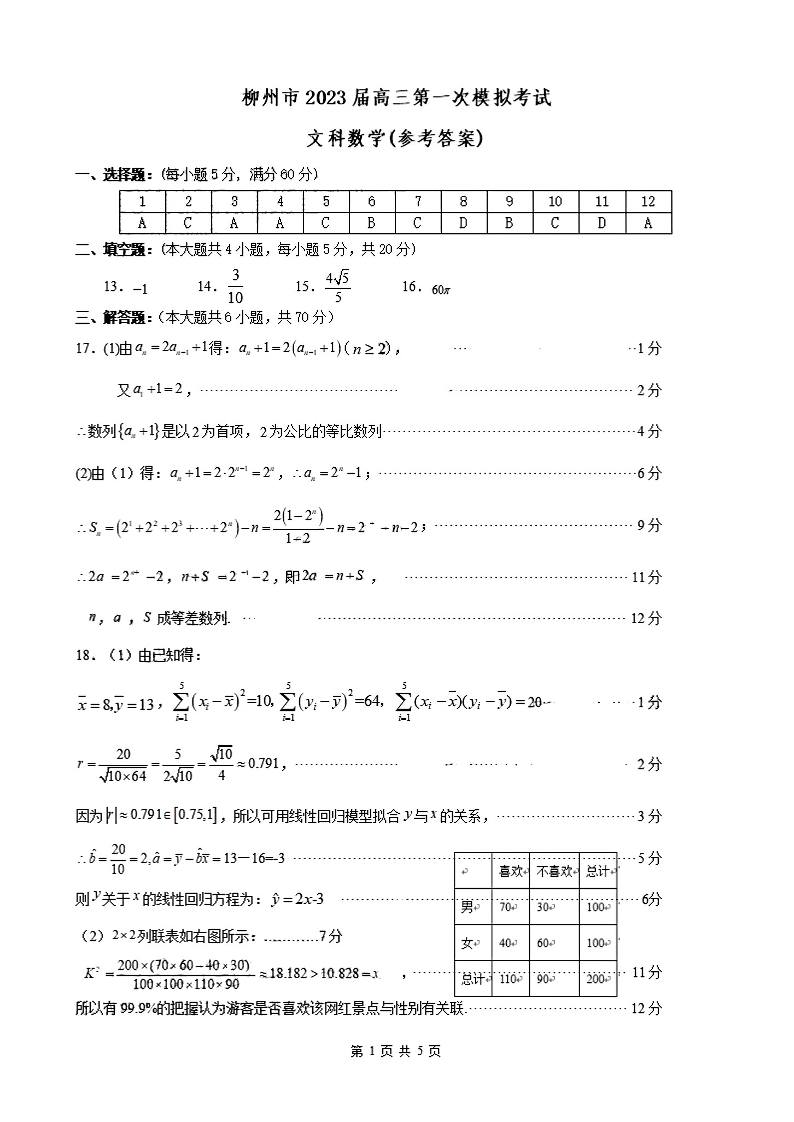 高三文数答案--广西壮族自治区柳州市2023届高三毕业班11月模拟统考(一模)