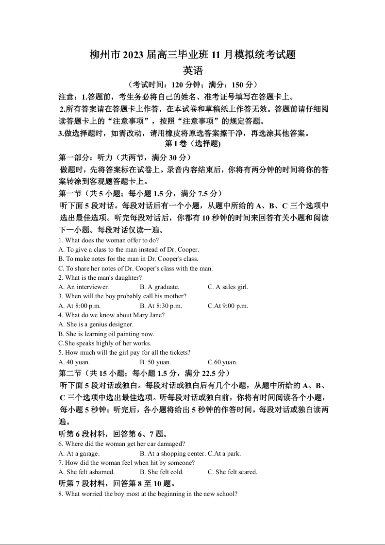 高三英语+答案--广西壮族自治区柳州市2023届高三毕业班11月模拟统考(一模)