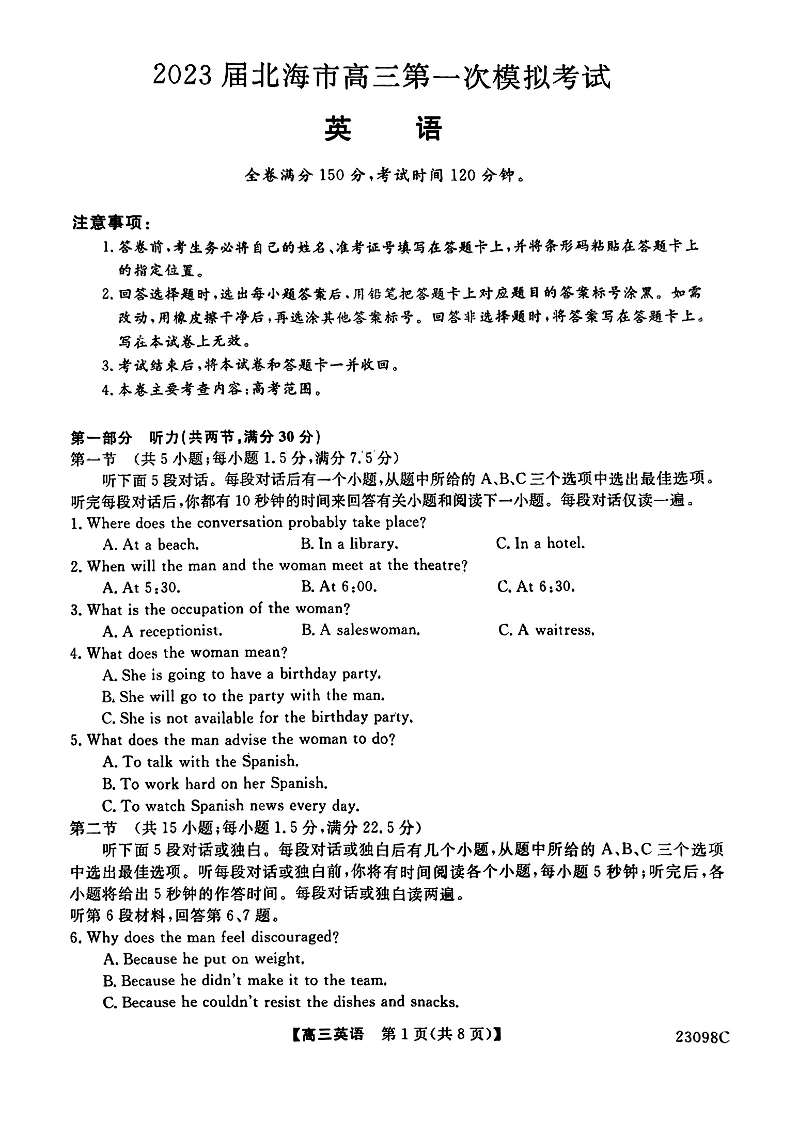 高三英语--广西北海市2023届高三上学期第一次模拟考试