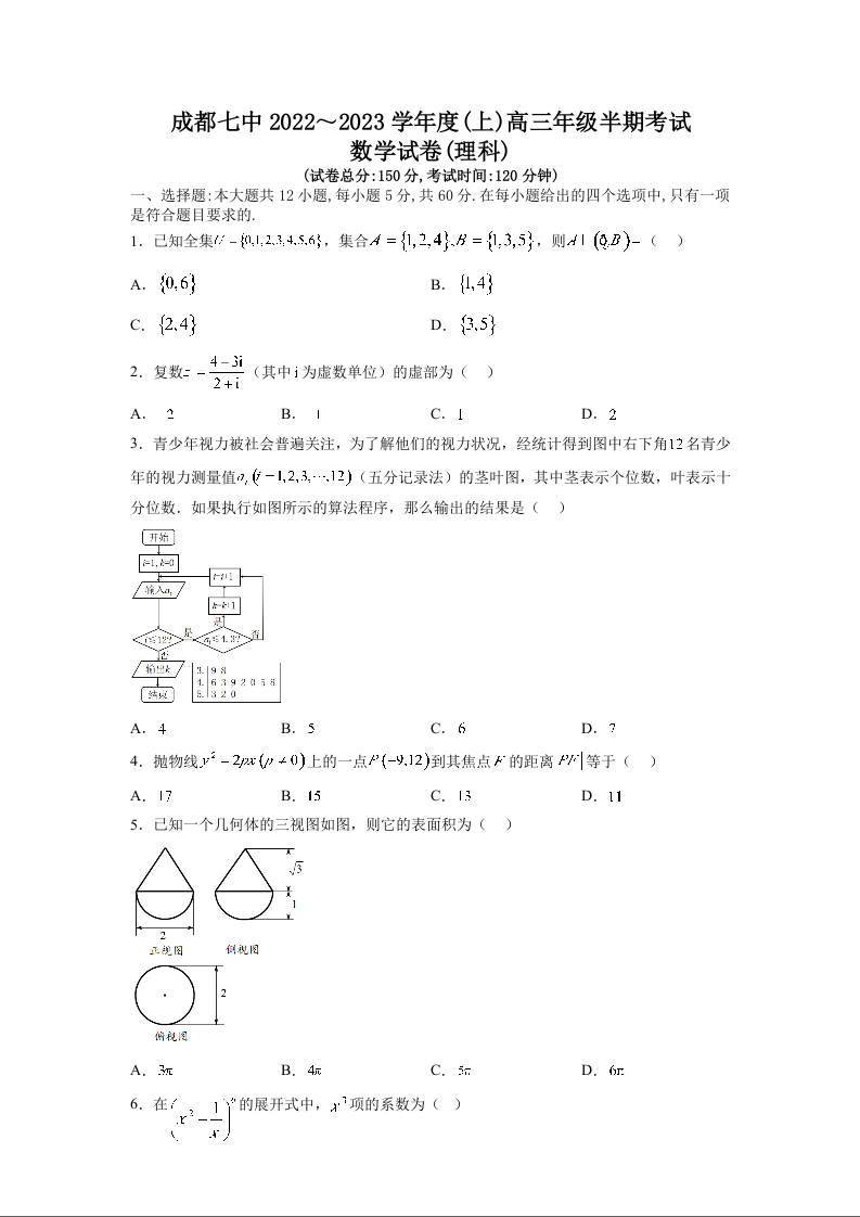 高三理数--四川省成都市第七中学2023高三上学期期中考试