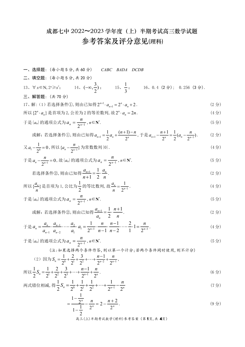 高三理数答案--四川省成都市第七中学2023高三上学期期中考试