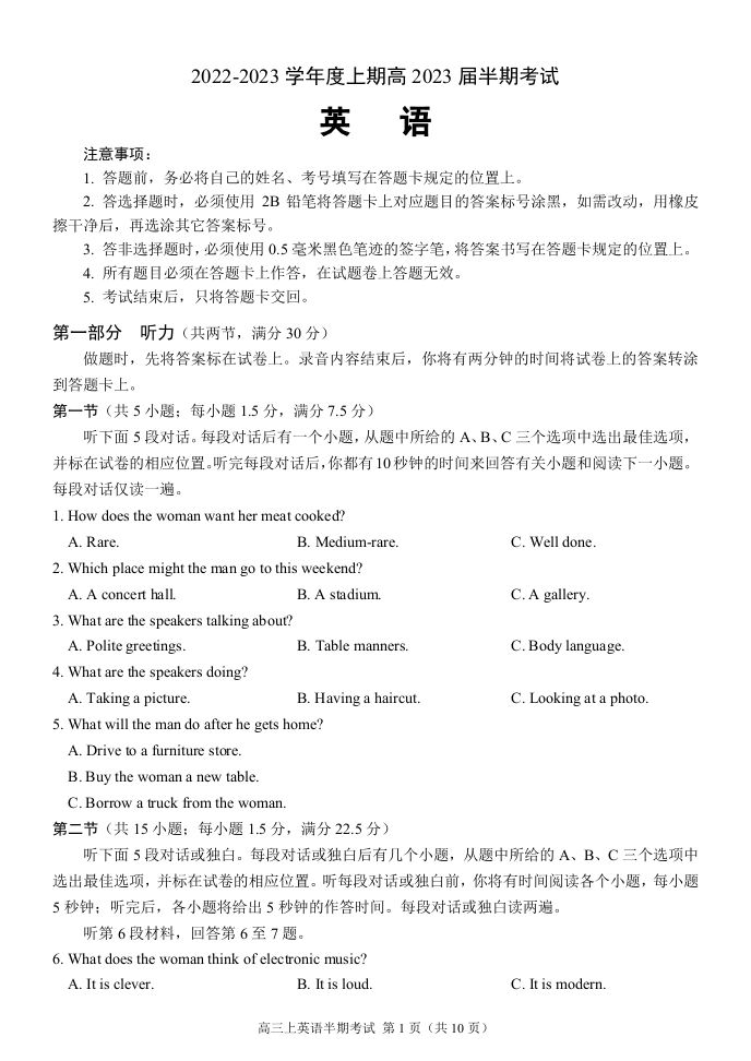 高三英语--四川省成都市第七中学2023高三上学期期中考试