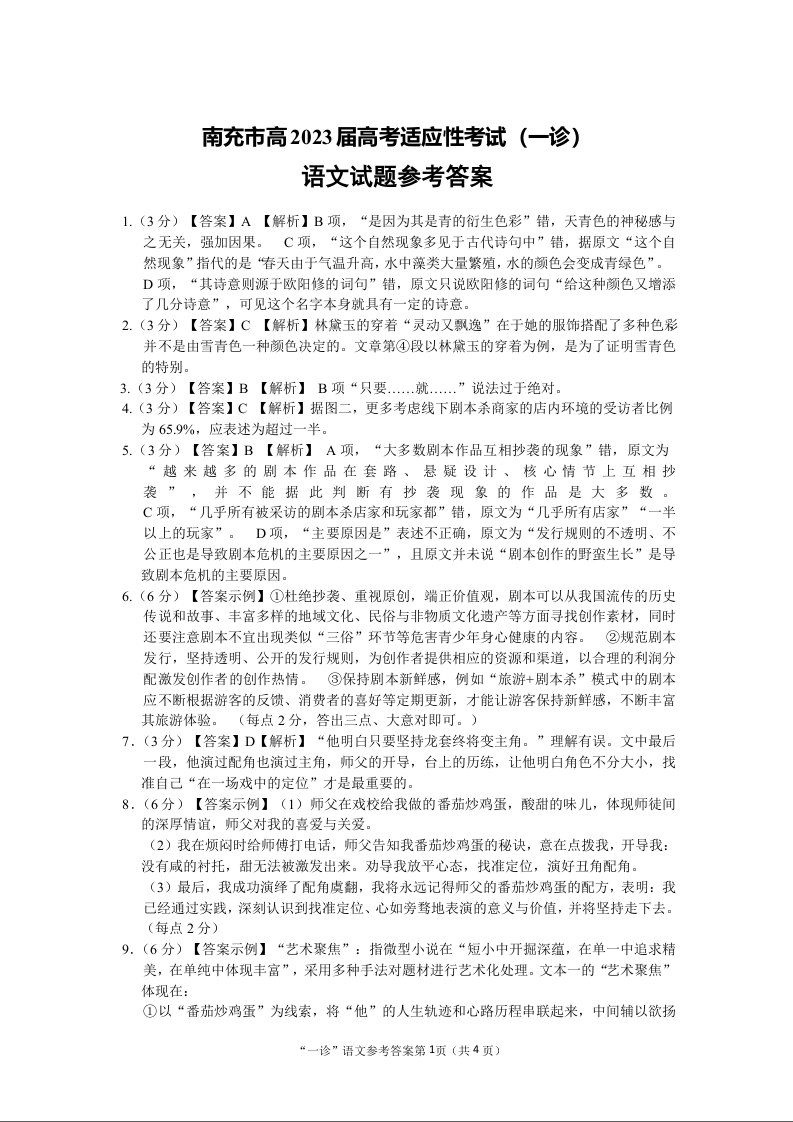 高三语文答案--四川省南充市2023届高三上学期高考适应性考试(南充一诊)