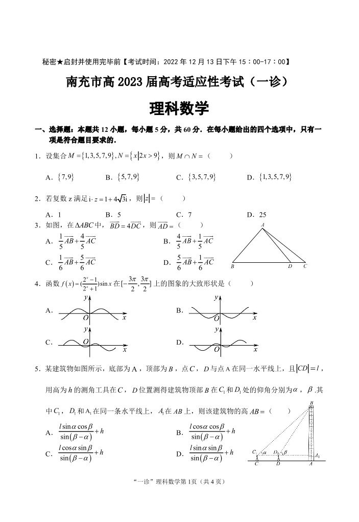 高三理数--四川省南充市2023届高三上学期高考适应性考试(南充一诊)