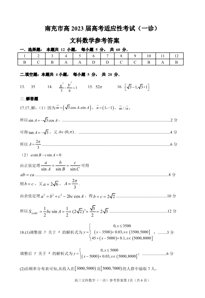 高三文数答案--四川省南充市2023届高三上学期高考适应性考试(南充一诊)