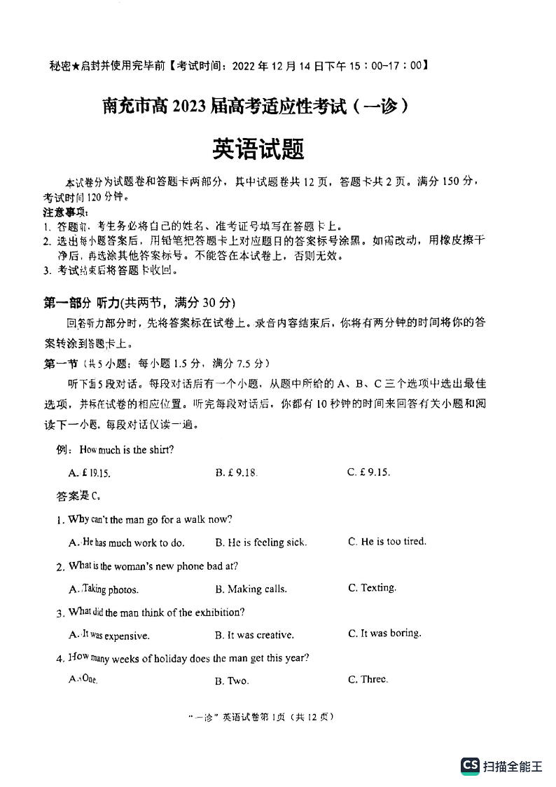 高三英语--四川省南充市2023届高三上学期高考适应性考试(南充一诊)