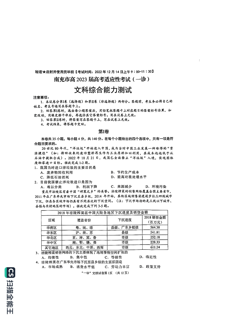高三文综--四川省南充市2023届高三上学期高考适应性考试(南充一诊)