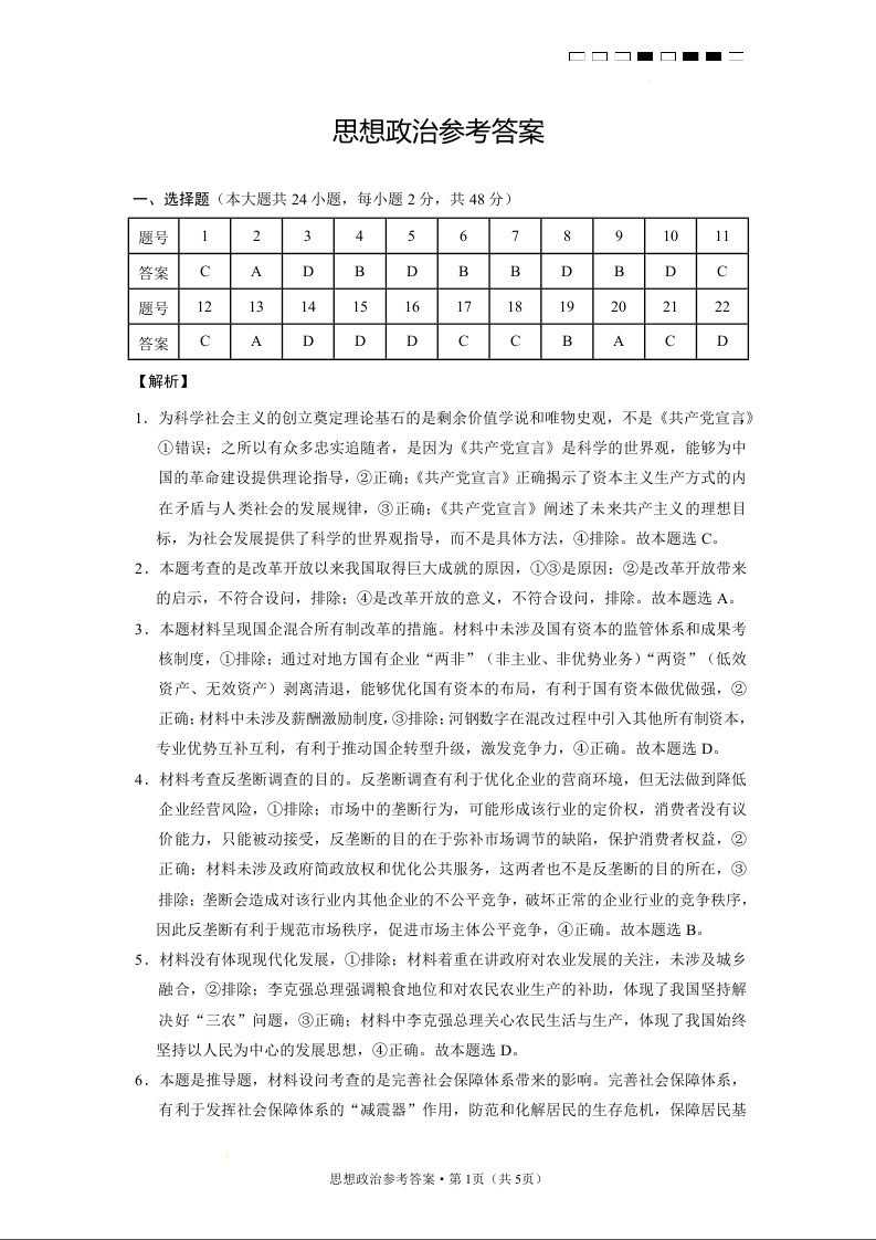 高三政治答案--云南省云师大附中2023届高三考适应性月考卷(一)