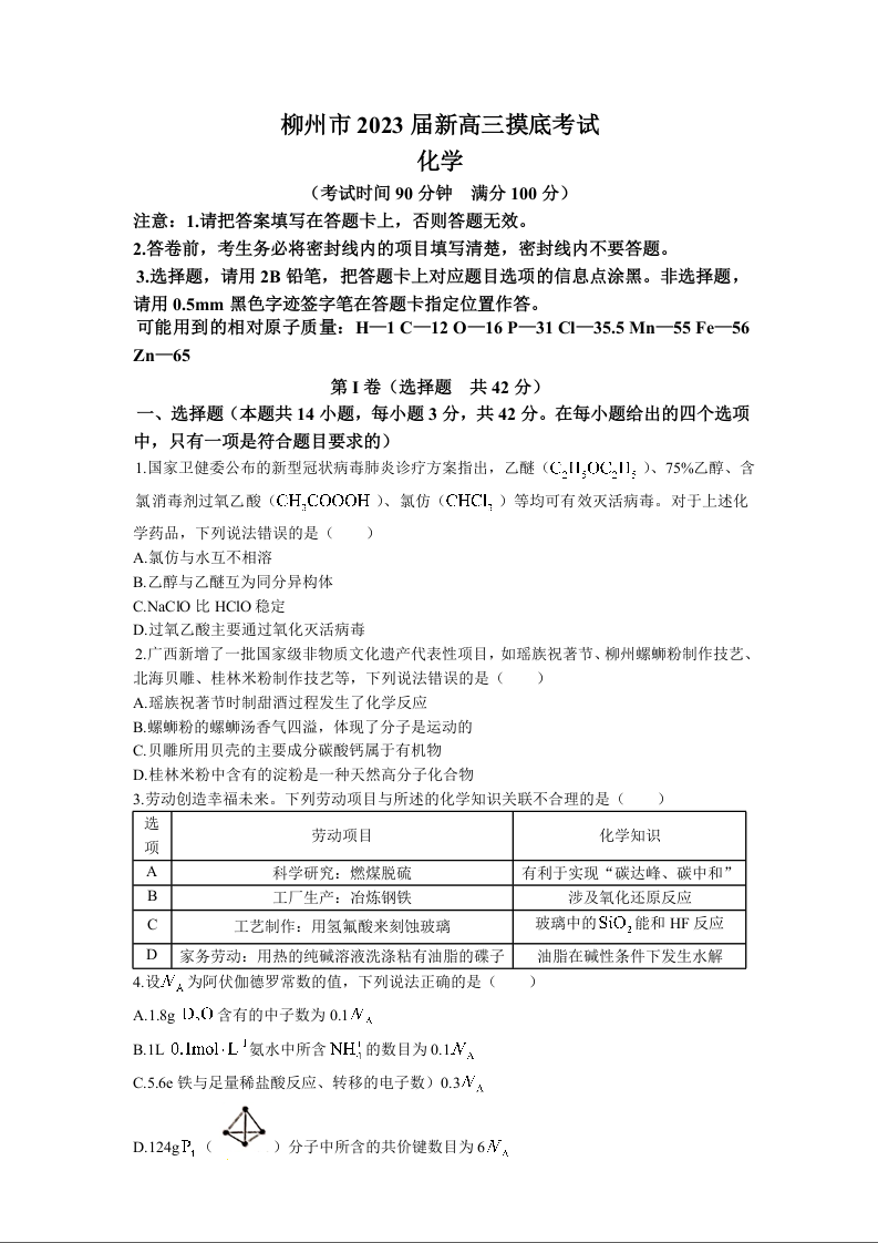 高三化学+答案--广西柳州市新2023届高三摸底考试