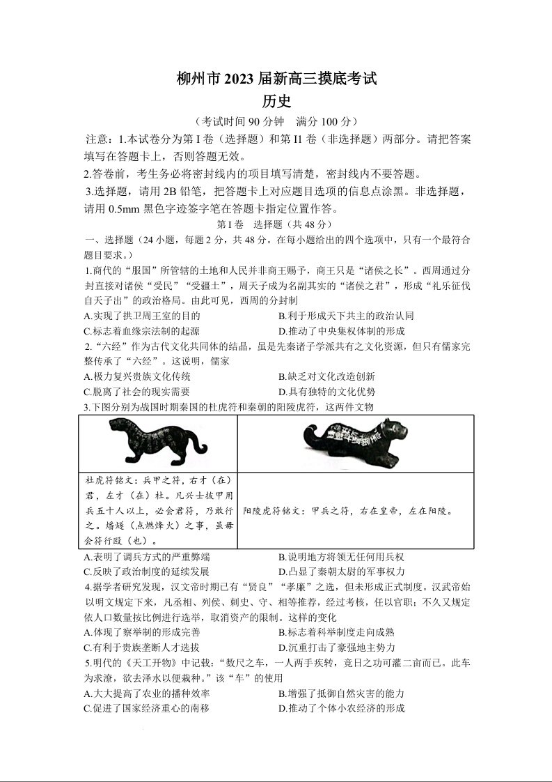 高三历史+答案--广西柳州市新2023届高三摸底考试