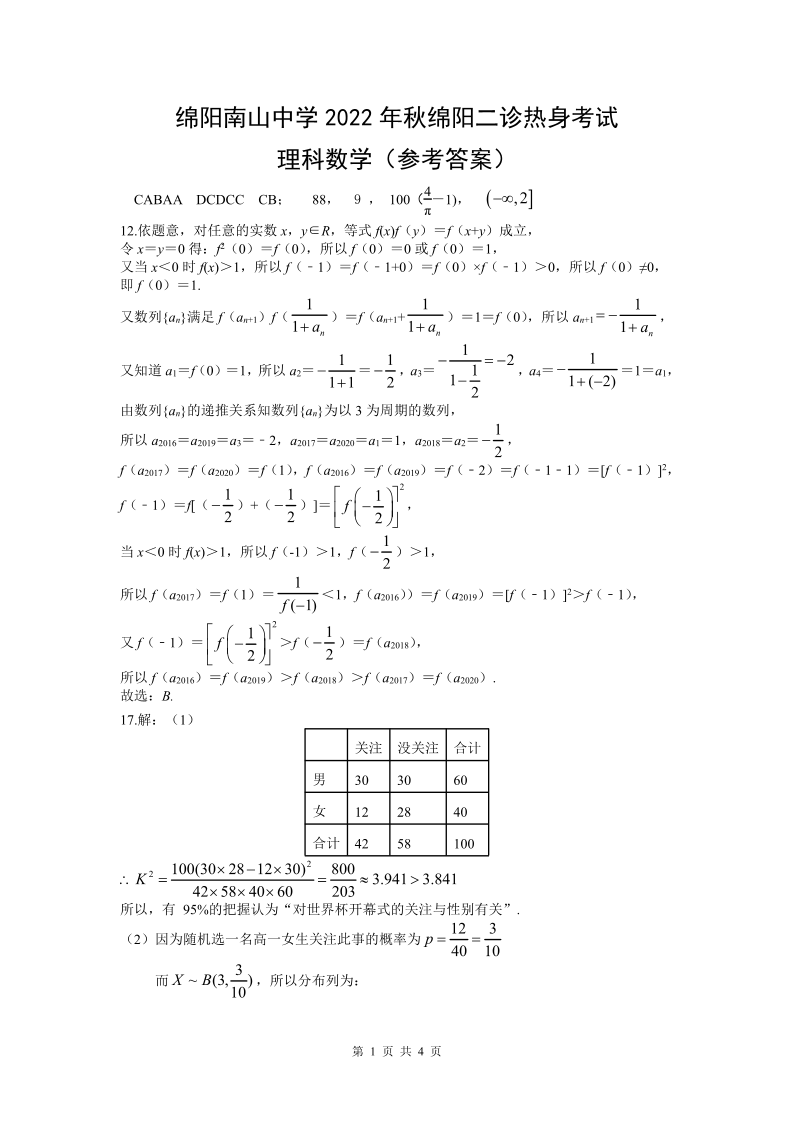 高三理数答案--四川省绵阳市南山中学2022-2023学年高三上学期二诊热身考试
