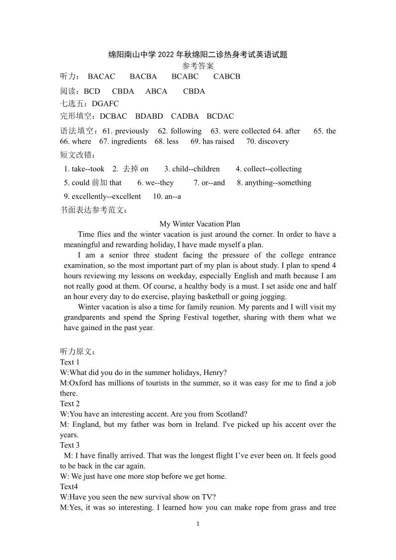高三英语答案--四川省绵阳市南山中学2022-2023学年高三上学期二诊热身考试