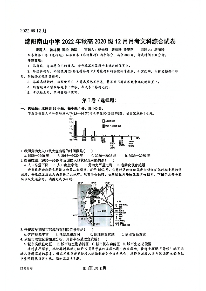 高三文综--四川省绵阳市南山中学2022-2023学年高三上学期二诊热身考试