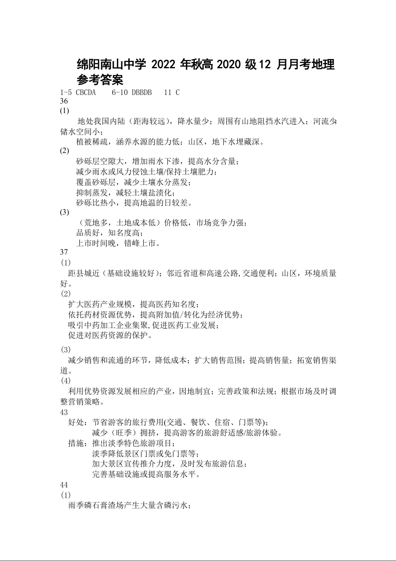 高三文综答案--四川省绵阳市南山中学2022-2023学年高三上学期二诊热身考试
