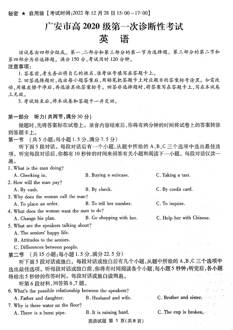 高三英语--四川省广安、遂宁、眉山、雅安、广元、资阳2023届高三上学期第一次诊断性考试