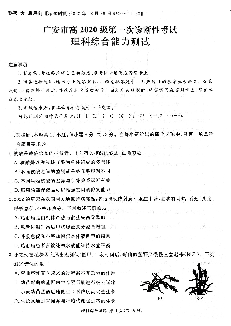高三理综--四川省广安、遂宁、眉山、雅安、广元、资阳2023届高三上学期第一次诊断性考试