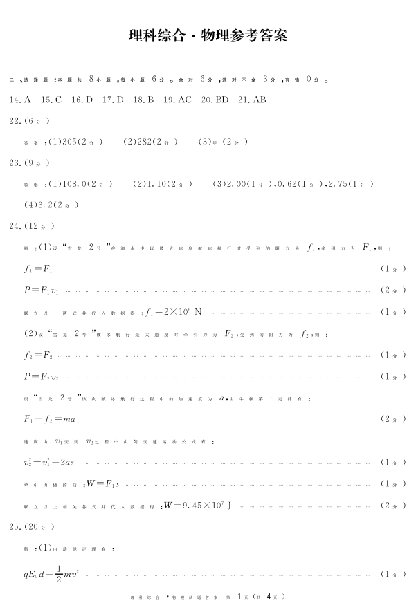 高三理综物理答案--四川省广安、遂宁、眉山、雅安、广元、资阳2023届高三上学期第一次诊断性考试