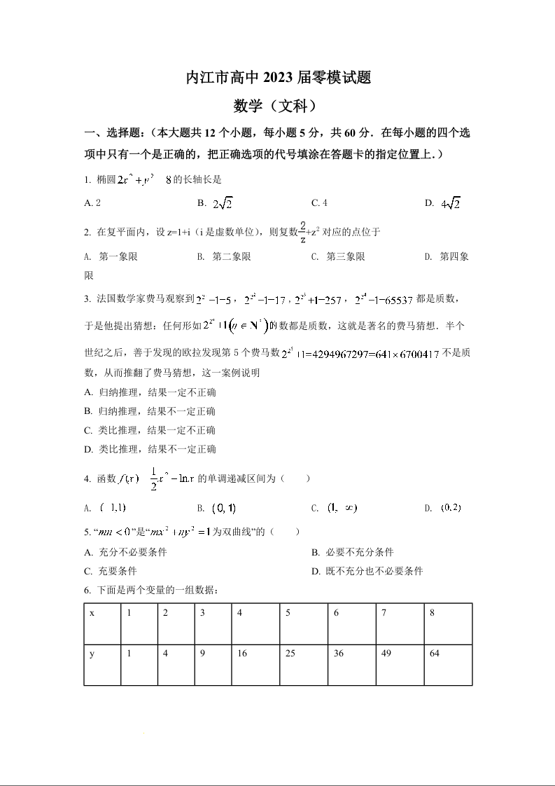 高三文科数学(原卷版)--四川省内江市2023届高三上学期(零模)