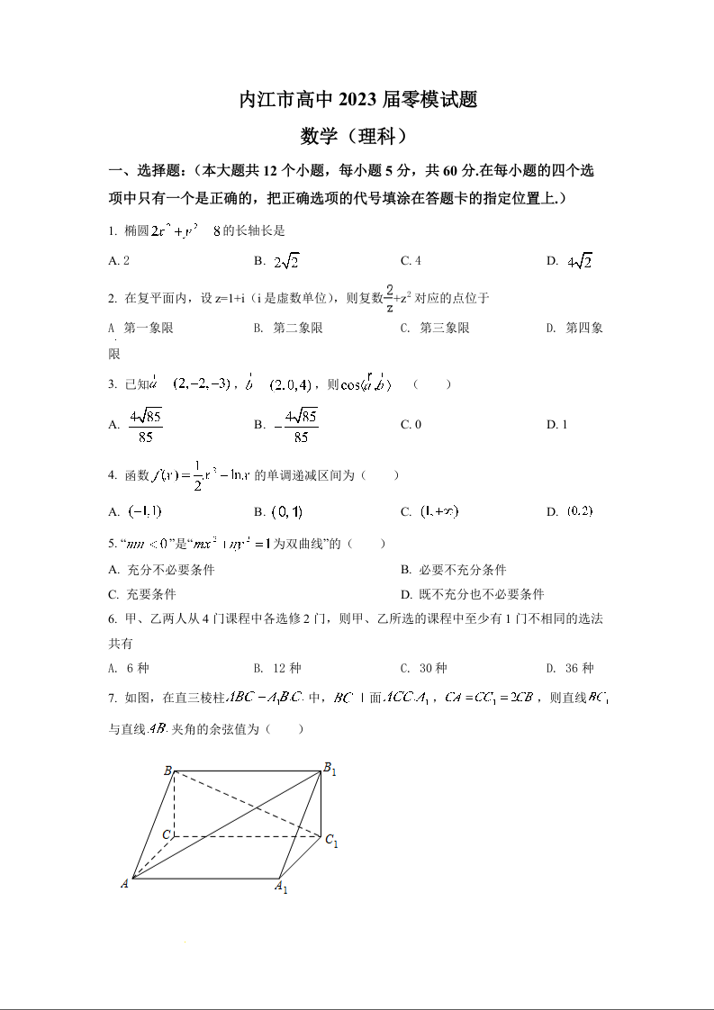 高三理科数学(原卷版)--四川省内江市2023届高三上学期(零模)