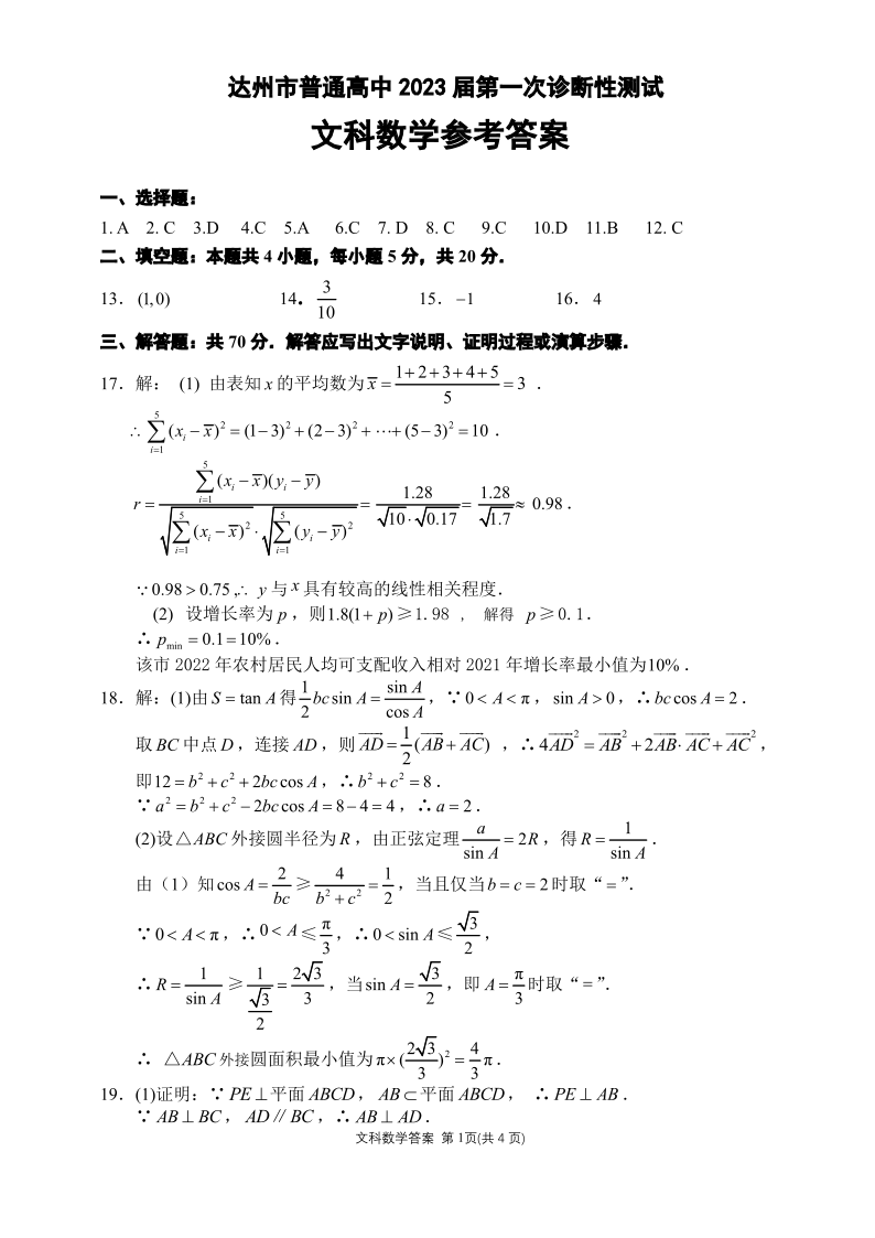 高三文数答案--四川省达州市普通高中2023届高三第一次诊断性测试