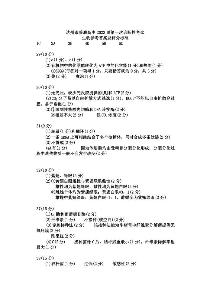 高三理综生物答案--四川省达州市普通高中2023届高三第一次诊断性测试