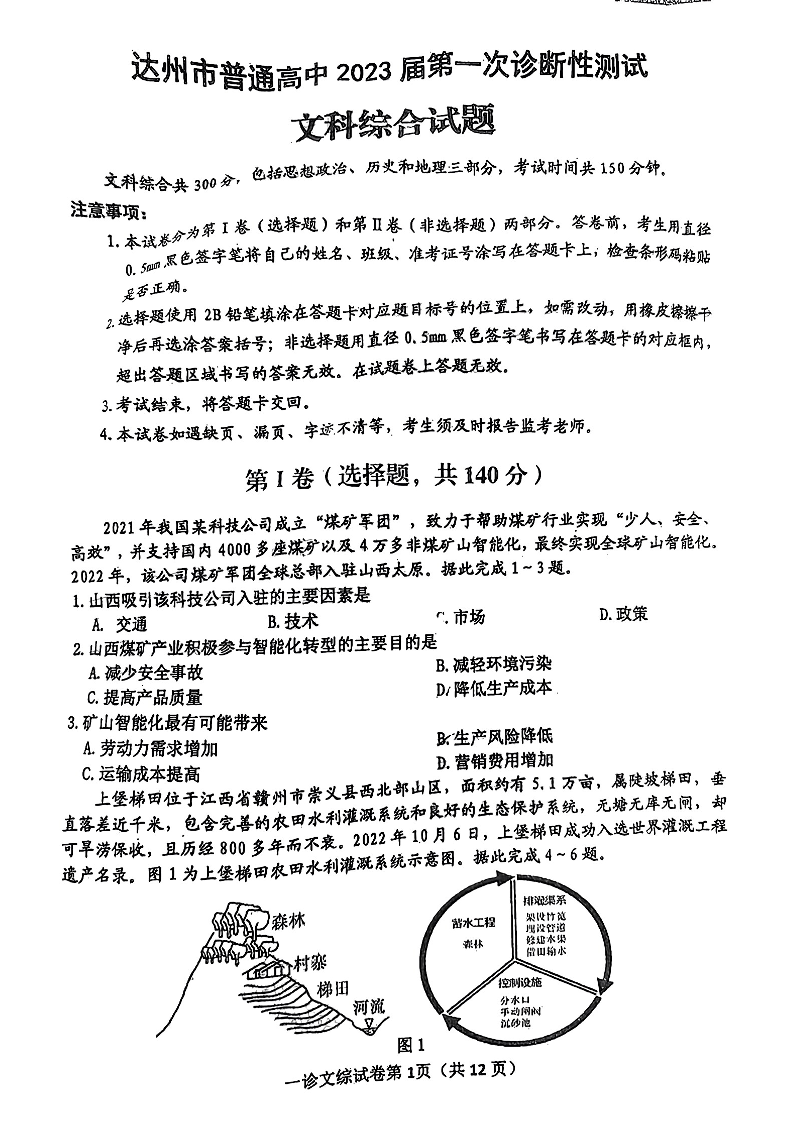 高三文综--四川省达州市普通高中2023届高三第一次诊断性测试